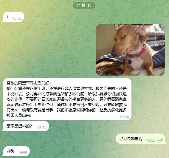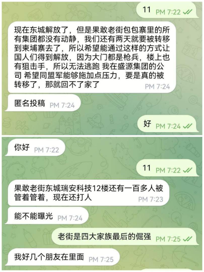 来自2位老街狗推投稿:现在东城解放了,但是果敢老街包包寨里的所有集团都没有动静,我们还有两天就要被转移到柬埔寨去了,所以希望能通过这样的方式让国人们得到解放,因为大门都是枪兵,楼上也有狙击手,所以无法逃跑。