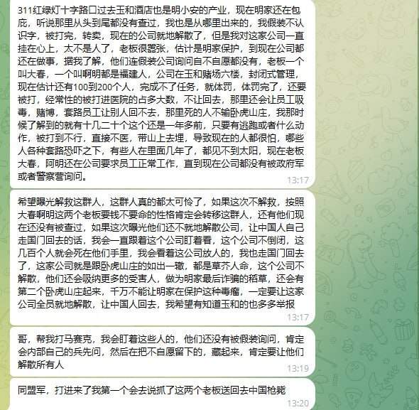 希望曝光出去能够解救这群人,这群人真的都太可怜了,如果这次不解救,按照大春阿明这两个老板要钱不要命的性格,肯定会转移这群人,还有一点,他们直到现在还没有被查过,如果这次曝光他们还不就地解散公司,让中国人自己走国门回去的话,我会一直跟着这个公司盯着看,这个公司不倒闭,这几百个人就会死在他们手里,我会看着这公司放人的,我也走国门回去了,