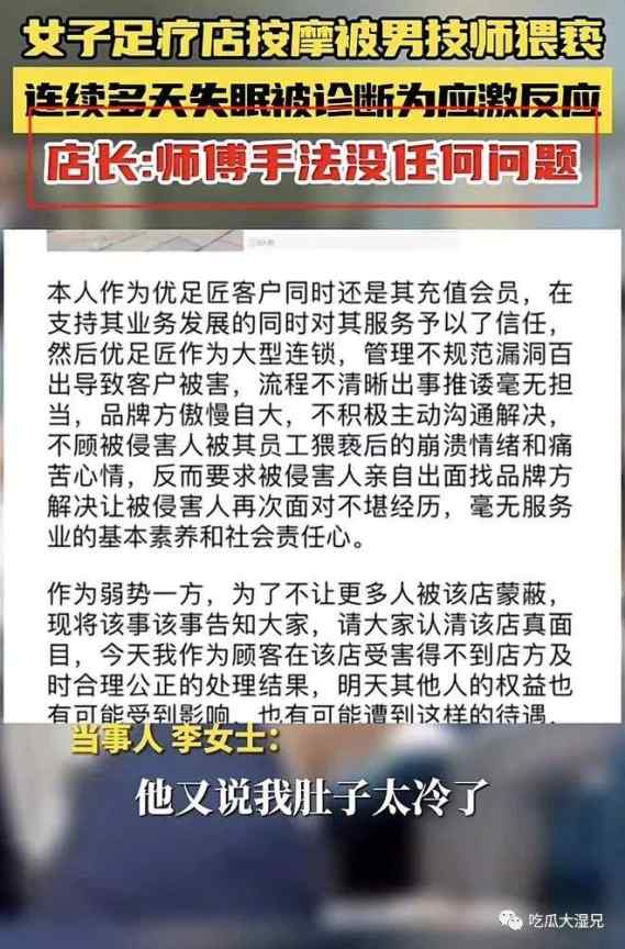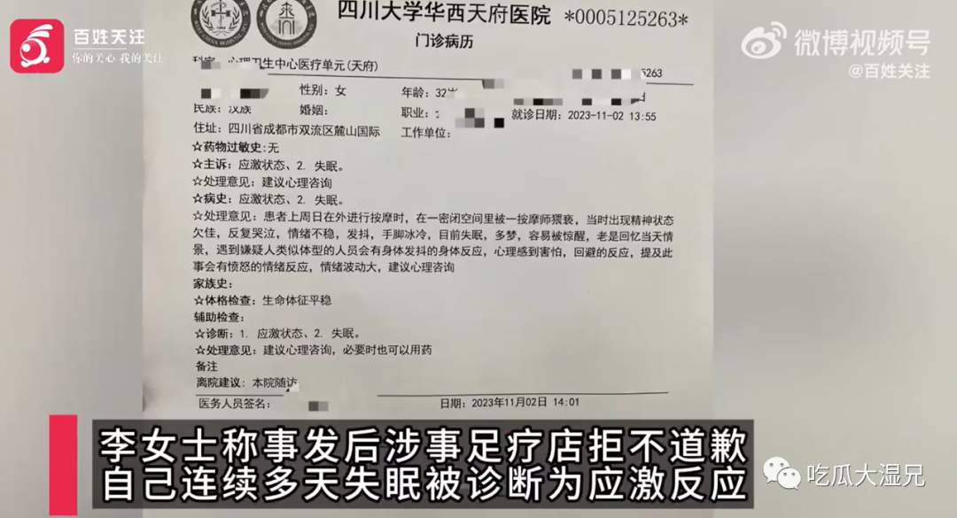 可李女士却说,足疗店方至今未对她道歉,而事件发生后,她连续多天都失眠,还被医生诊断出应激反应。这事给她的生活和心理都造成了不小的冲击。