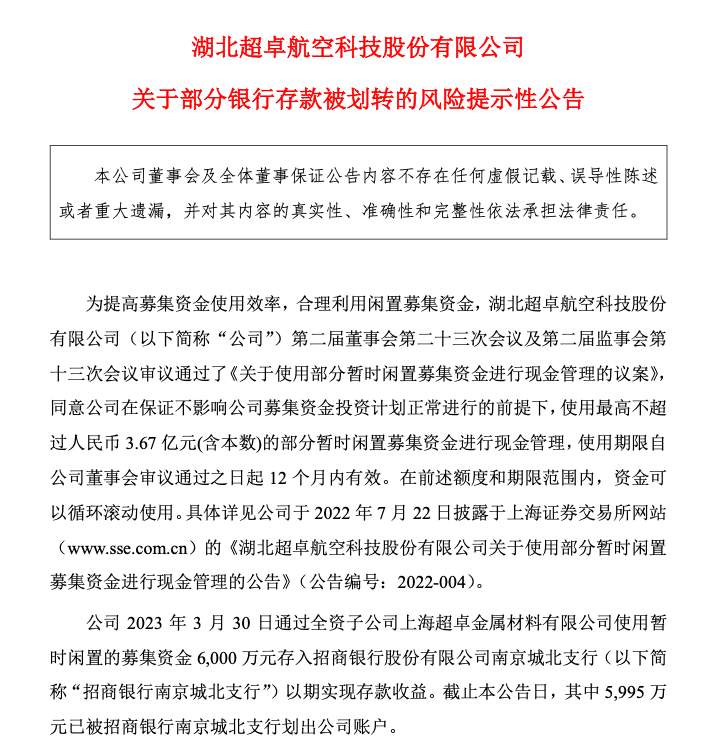 根据超卓航科披露,今年3月30日,公司通过全资子公司上海超卓金属材料有限公司使用暂时闲置的募集资金6000万元存入招商银行南京城北支行以期实现存款收益,10月7日,这笔5995万元的资金却被招商银行南京城北支行划出公司账户。