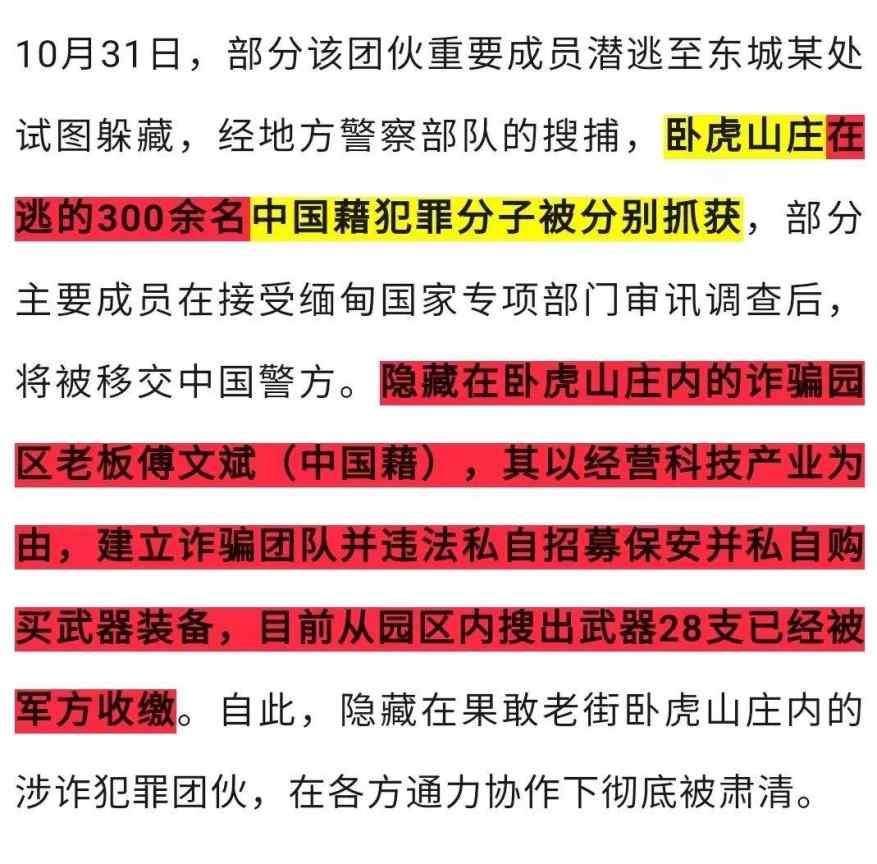 据悉,10月30日缅甸国家政府委派军方专项对卧虎山庄涉诈团伙进行调查、搜捕,当天就在卧虎山庄抓捕了700余名中国藉非法入境涉诈人员。