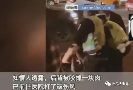 然后他打了该男子的女朋友。为了保护女友,男子继续抱住女友,随后被路边女子咬伤。背上的一块肉被咬掉了。
