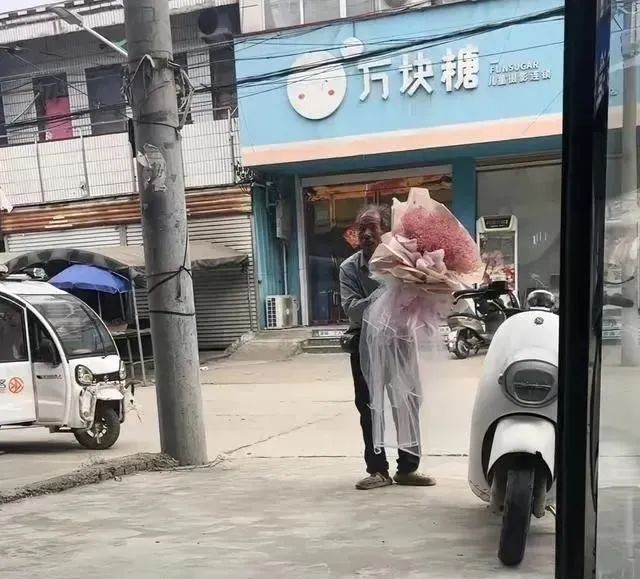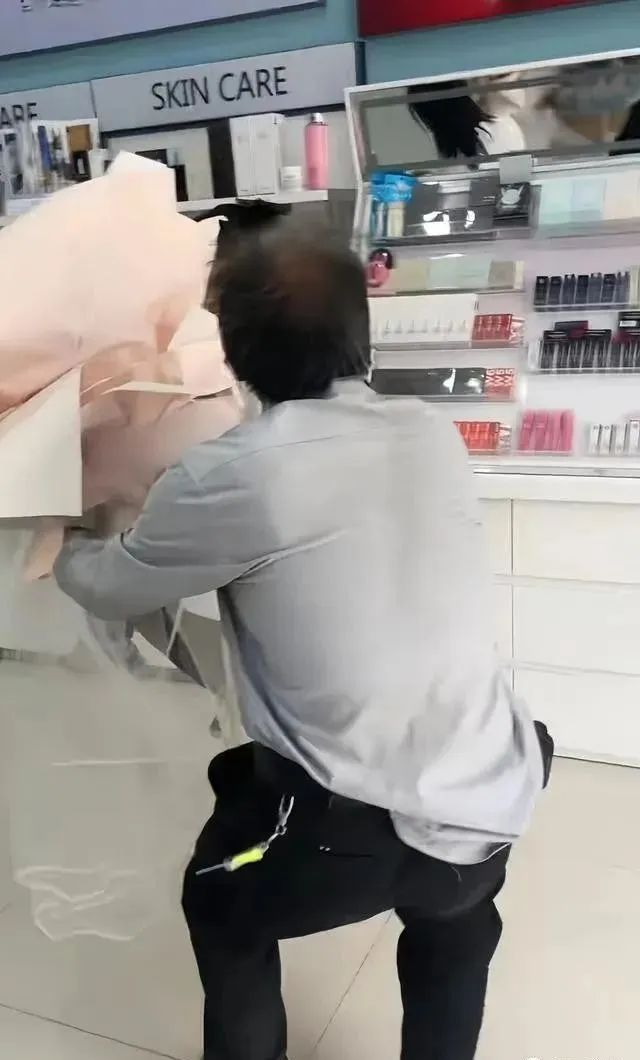 一个70多岁的老大爷手捧着一大束鲜花,在一家化妆品店内徘徊。