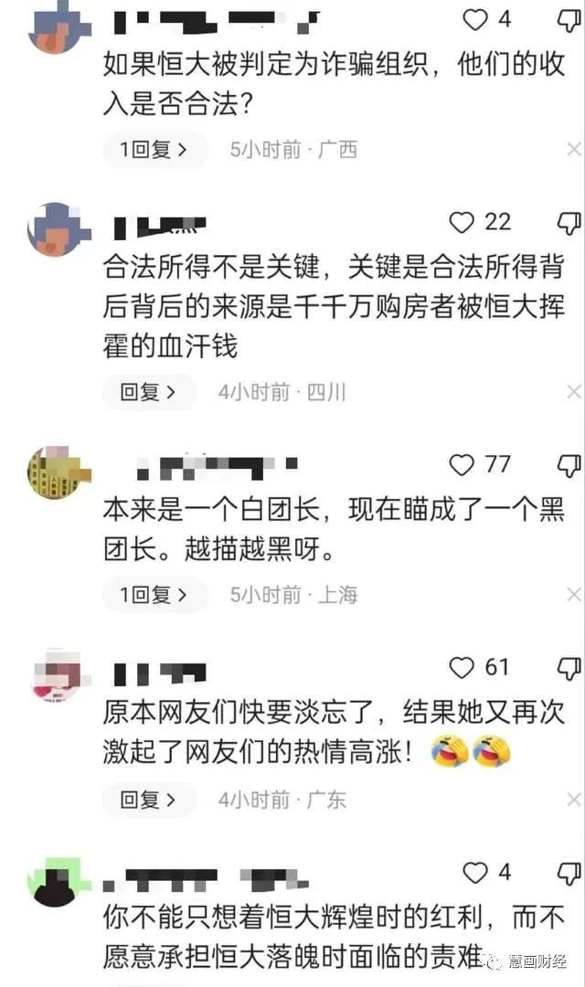 可能她还没弄明白,恒大暴雷欠下2万亿的背后是数百万的平民阶级受害者的血汗钱。
