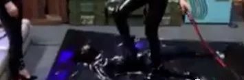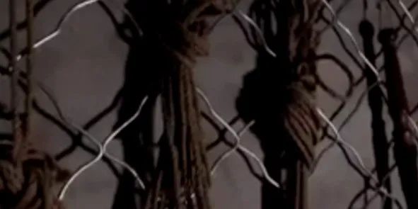 用胶袋捆绑起来的人,悬挂在横梁上来回荡秋千。