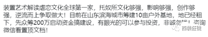 据该推主说,除了北京,已经在山东建了一个10亩的户外基地,咱也不知道是真的还是在吹NB... 反正是在以这个理由众筹。