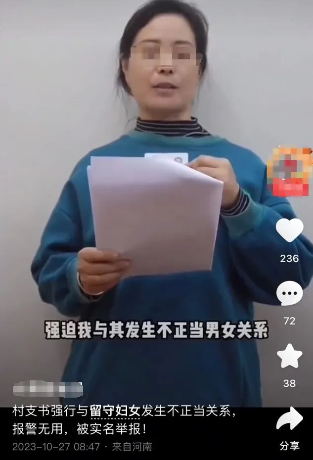 相关视频称“村支书强行与留守妇女发生不正当关系,报警无用,被实名举报”。
