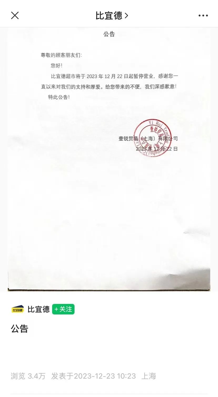 12月23日,定位硬折扣社区连锁超市的比宜德发布公告称,于2023年12月22日起暂停营业。毫无征兆,也暂未公布原因。消息在互联网上传播,有的老顾客震惊:“怎么说没就没了?”有的网友一头雾水:“比宜德是啥?怎么没听说过?”资料显示,比宜德是由德国人Philipp Spangenberg在中国创办的硬折扣店品牌,运营多年,在中国已有超过200家门店。在网上,有人将它称为“穷人的快乐屋”。12月23日,来自“比宜德”微信公号的消息称,称比宜德超市于22日起暂停营业,感谢顾客一直以来的支持和厚爱。对比,上海李女士感觉很惊讶,因为昨天她还逛过家附近的比宜德,并没有从店员那儿听说即将停业。而就在12月22日,“比宜德”微信公号还发布了大促的消息。