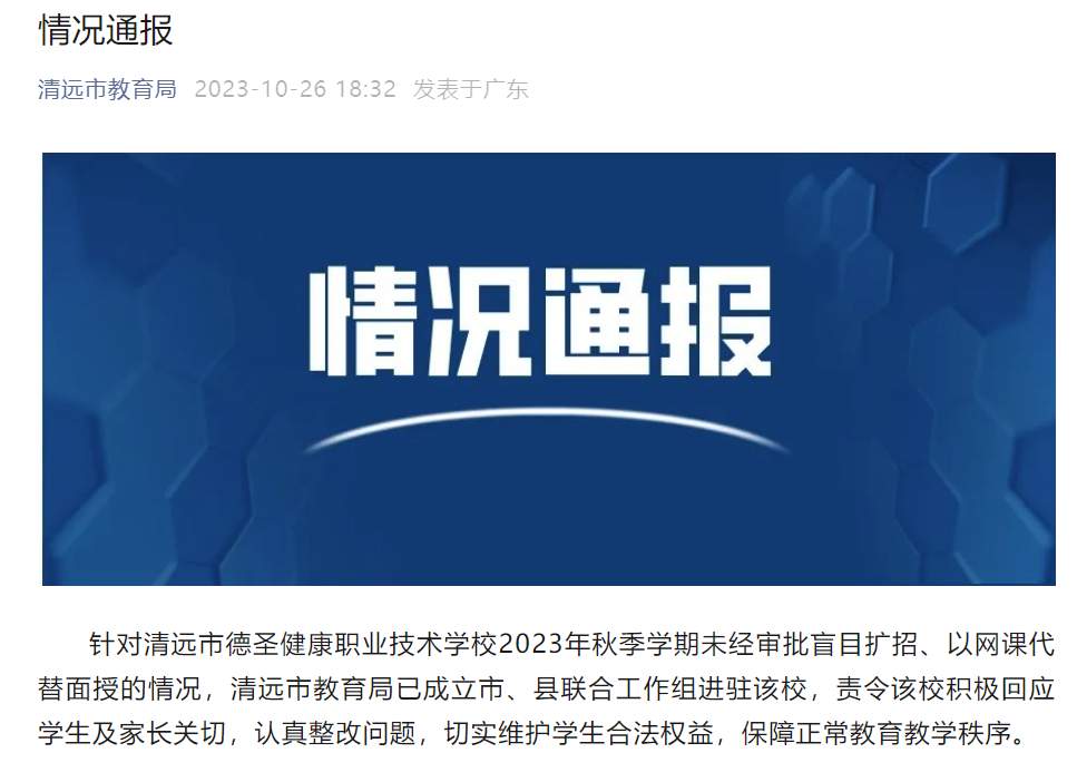 对此,清远市教育局官微10月26日通报称,针对清远市德圣健康职业技术学校2023年秋季学期未经审批盲目扩招、以网课代替面授的情况,清远市教育局已成立市、县联合工作组进驻该校,责令该校积极回应学生及家长关切,认真整改问题,切实维护学生合法权益,保障正常教育教学秩序。