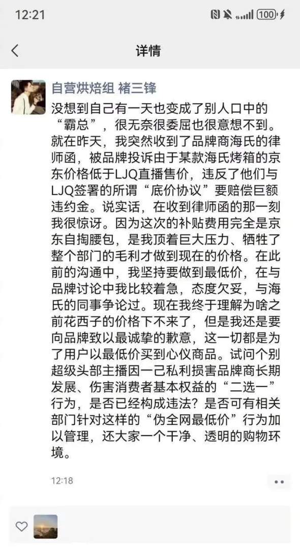 然后京东就收到了品牌商海氏的律师函,被品牌投诉由于某款海氏烤箱的京东价格低于李佳琦直播售价,违反了他们与李佳琦签署的“底价协议”,并要求赔偿巨额违约金。