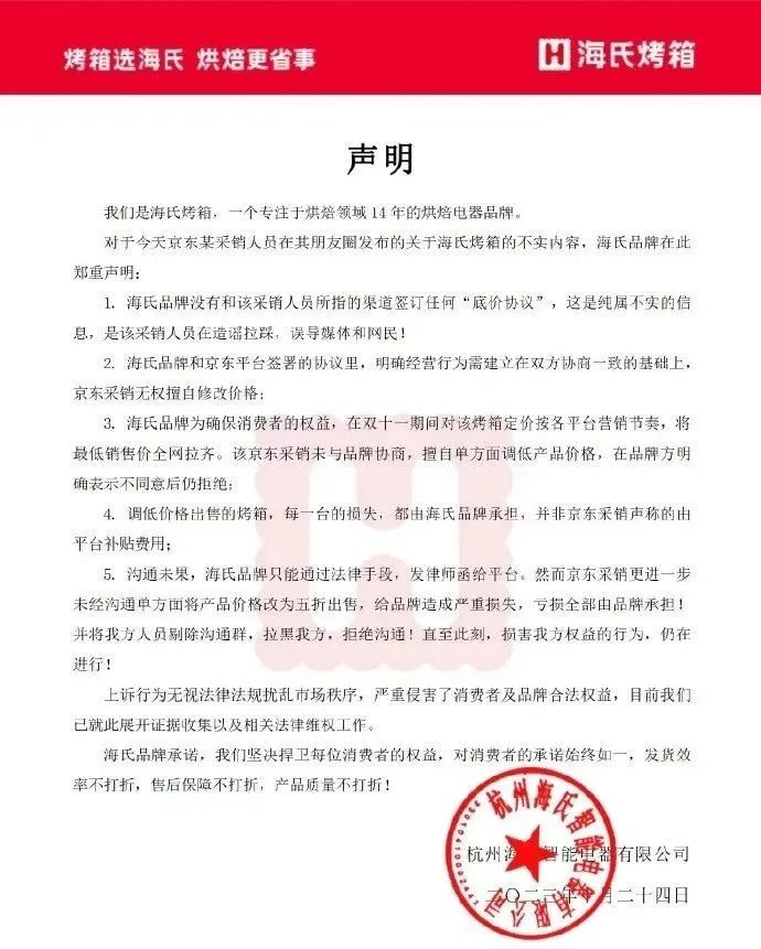 后来,另一主角海氏品牌方在微博发布声明,表示“低价协议”不存在,京东采销无权擅自修改商品价格,且优惠价格部分均由品牌方补贴,而非平台出资。并将我方人员别除沟通群,拉黑我方,拒绝沟通!