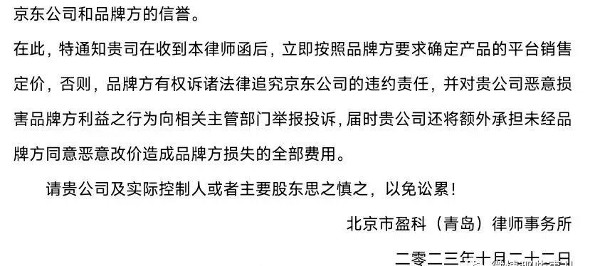 从律师函中可以看出,京东该部门修改了该商品价格,造成海氏公司与其他客户合作合同中被动违约。