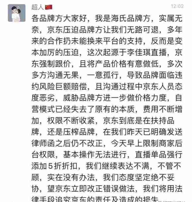 一名海氏品牌方工作人员称:京东强制跟价李佳琦直播间价格,且将产品价格有意做低,多次多方沟通无果,导致海氏品牌面临违约风险巨额赔偿。目前京东已经限制商家后台权限,基本操作无法进行,直播单品强行添加5折折扣。海氏将用法律手段追究京东的责任及造成的损失。