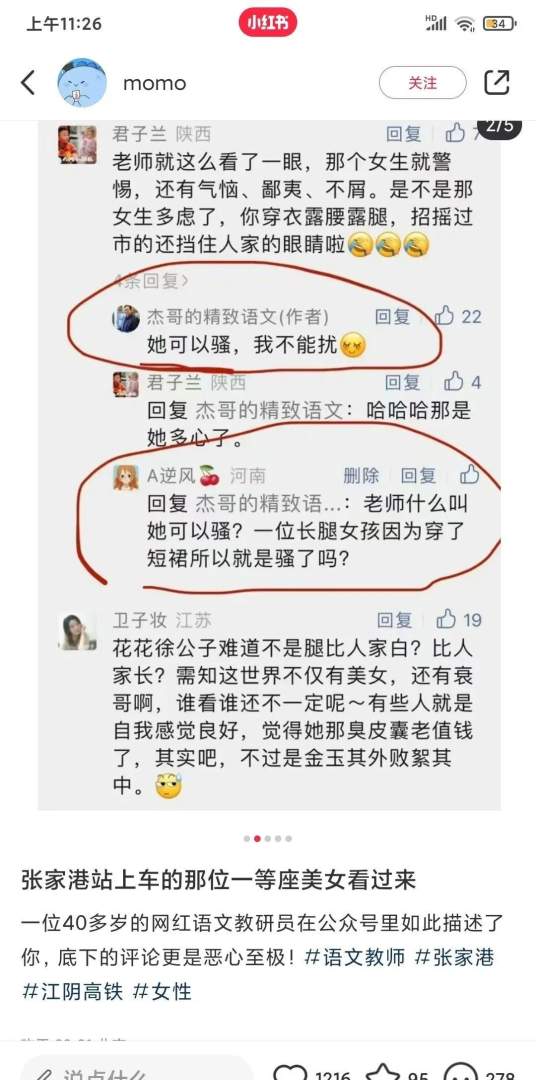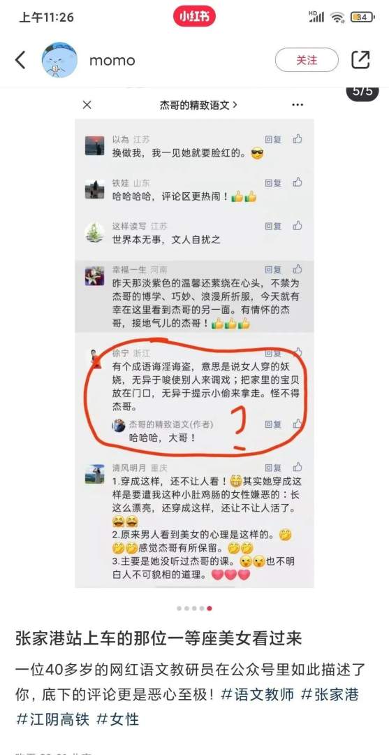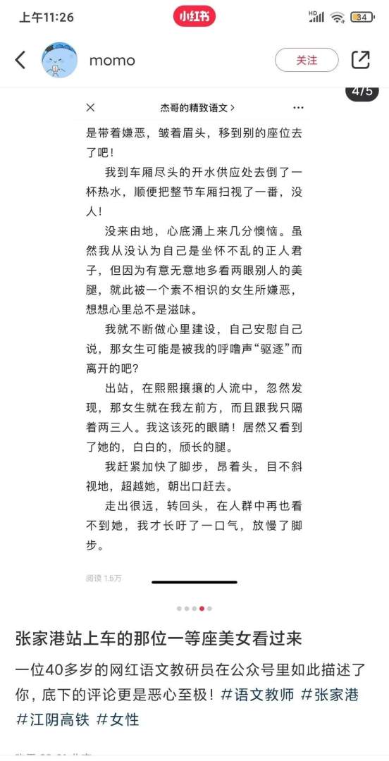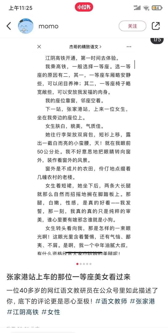 10月22日,一线网红教师所发布的一篇名为《被嫌弃》的文章在网络上引起热议。文章中,作者对并不相识的同车女乘客发布了一些疑似“意淫”的不当言论,评论区的风向也遭带偏。