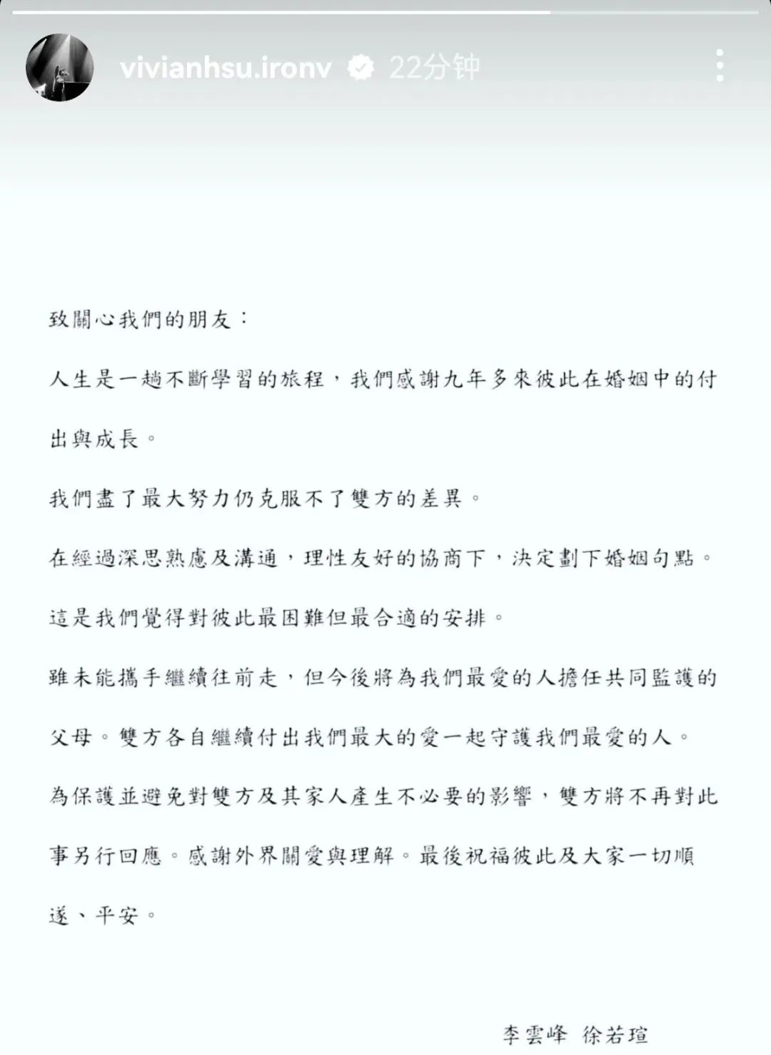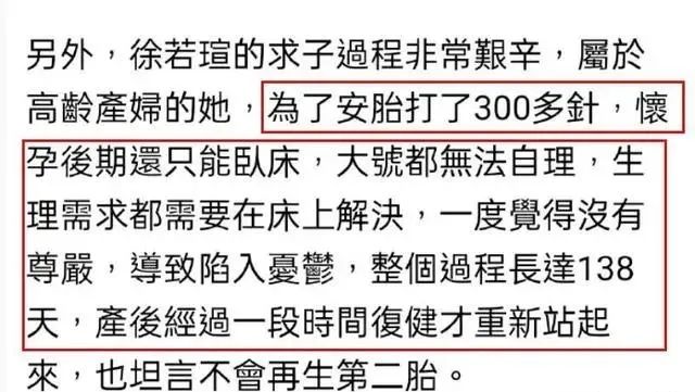 但后台有吃瓜er表示想看她的笑话,那这里咱们就来讲一讲她这个事~徐若瑄和李云峰是在2013年相识,当时李云峰是徐若瑄电影的投资商。鉴于李云峰富商的身份,即便其离过婚,还带着两女儿,但当时徐若瑄各种上了头钓凯子(提一嘴,湾湾那边的女星,特别是徐若瑄、大S、吴佩慈等人10年那会都很热衷于勾搭富豪,见个有钱人就往上扑的那种),疯狂和男方搞暧昧,2014年,两人结了婚~之后徐若瑄长住新加坡,每次露面都以阔太自居,但李家觉得她黑料多(三级片出身),不太能看得上她。她为了稳固地位,开始拼儿子,怀孕以后,她更是打了300多针保胎针,且长达五个月卧床休息,大小便不能自理的那种!后来生下儿子,她以为自己终于可以扬眉吐气了,但没多久,李云峰的公司资金链断了,差点破产,为了帮老公,徐若瑄复出捞金~等到好不容易情况好转,李云峰拉到了天使投资人挽救公司后,李家又有点看不上徐若瑄了,把她赶回了湾湾。如果说只是分居两地,那他们不至于这么快be,徐若瑄这一波被豪门过河拆桥+无情抛弃,一个很重要的原因就是她私生活方面太过于滥交了!但大家要知道,徐若瑄15岁开始就拍那种露三点的全裸写真,出道之初更是在大尺度三级片里混,然后吧,可能是耳濡目染,也有可能是本性如此,总之,她滋生出了强烈的性瘾症~没结婚前,她和王力宏、黑人等一帮人玩得飞起,结婚后去了新加坡。她收敛了一阵子,可前几年被李家赶回湾湾,她寂寞难耐,就此故态复萌了,多次和王力宏他们开yin趴、群趴。特别是这件事还被李靓蕾爆了出来,从那时候起,被全网笑话戴了绿帽子的李云峰就以此事为由头,开始逼着徐若瑄走离婚程序了,当下他们签字离婚,也是流程走完的结果。而这段婚姻中,徐若瑄基本没有捞到啥,就连孩子的抚养权现在都是在李云峰手里的!毕竟豪门不是小白兔,豪门在算计人方面更歹毒下流,徐若瑄这纯属是种瓜得瓜,