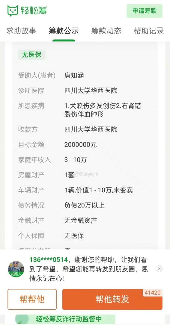 成功筹集到了200万元的医疗金额