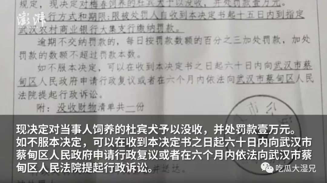 武汉市民凌先生反映其母亲遛狗时被一只未拴绳的杜宾犬攻击,人和自家狗均有受伤。10月19日,凌先生表示已收到警方处理决定,杜宾犬被没收,对方狗主人被罚款一万元。