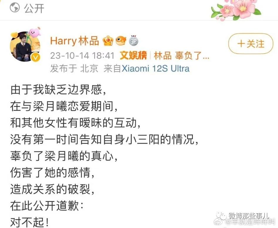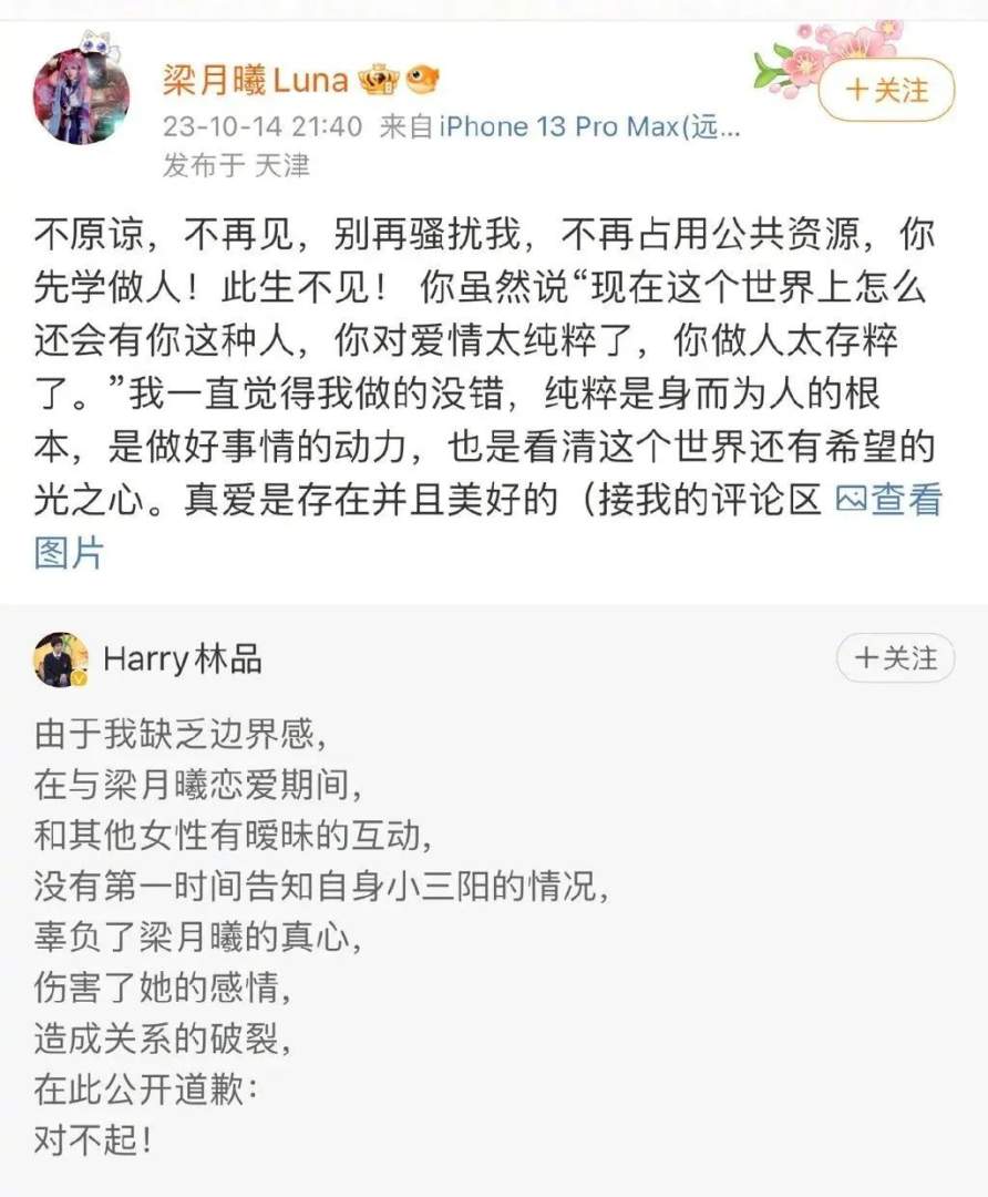 10月14日,林品发文回应女友爆料,称:“由于我缺乏边界感,在与梁某恋爱期间,和其他女性有暧昧的互动,没有第一时间告知自身小三阳的情况,辜负了梁某的真心,伤害了她的感情,造成关系的破裂,在此公开道歉:对不起!”