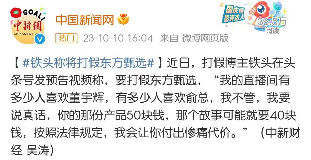 10月9日,网红“铁头惩恶扬善”在直播时预告将于下个月初打假东方甄选的产品。