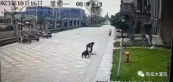 视频显示,在一栋居民楼下方的草地上,一只大型黑色犬只正疯狂撕咬倒在地上的孩子,疑似孩童母亲正用身体保护着孩子。另一只白犬不停在周边转圈,有人拿着拖把试图驱赶犬只。