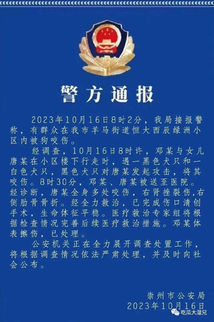 经调查,10月16日8时许,邓某与女儿唐某在小区楼下行走时,遇一黑色犬只和一白色犬只,黑色犬只对唐某发起攻击,将其咬伤。8时30分,邓某、唐某被送至医院。经诊断,唐某全身多处咬伤,右肾挫裂伤,右侧肋骨骨折。经全力救治,已完成伤口清创手术,生命体征平稳。医疗救治专家组将根据检查情况完善后续医疗救治措施。邓某体表擦伤,已处理。