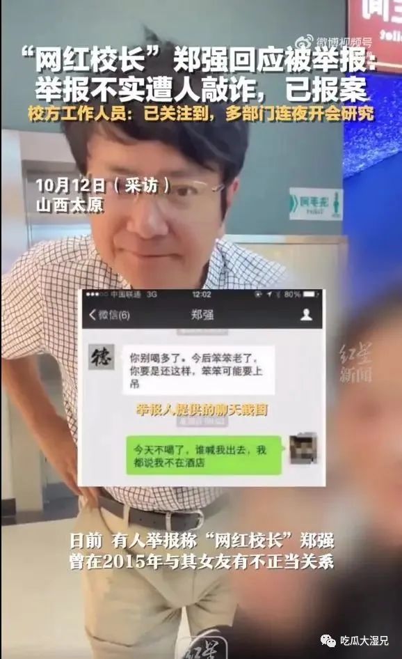 10月10日晚,一位昵称为“华趣”的网友在社交平台发文,举报郑强教授婚内出轨,包养情妇。郑强以观点犀利著称,很多演讲视频被学生传到网上。在贵州大学任内,郑强被网友称为“最牛校长”“网红校长”,被评为“最受大学生喜爱的校长”。 10月12日中午,“郑强教授”微信吃瓜网发布声明:近期在网络上进行发布和传播虚假信息的账号“华趣”,现已证实其发布人实名认证为吕某,系刑满释放犯罪人员,所发布的全部文字与图片内容均为恶意编造、虚构的不实信息。同时,北京中伦文德太原律师事务所接受郑强教授委托发表声明,将依法予以维权。