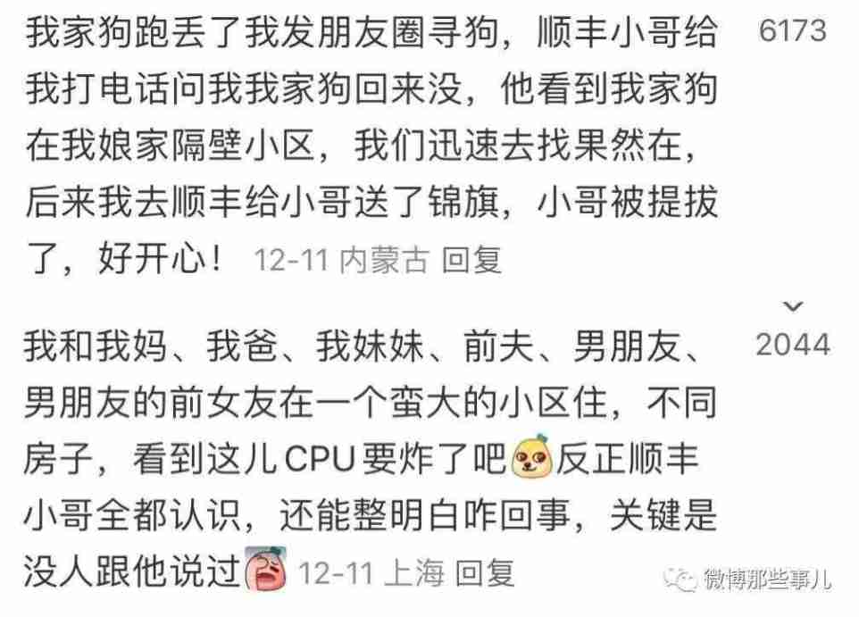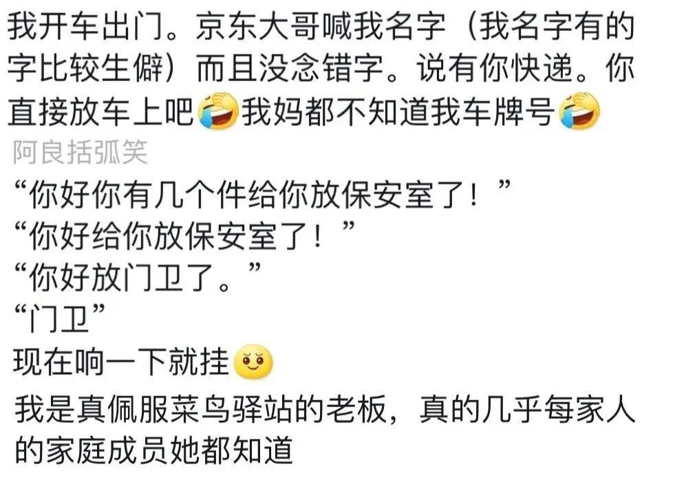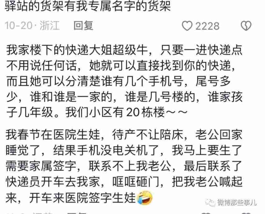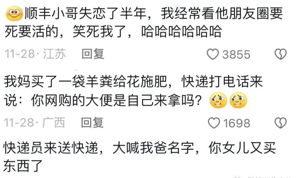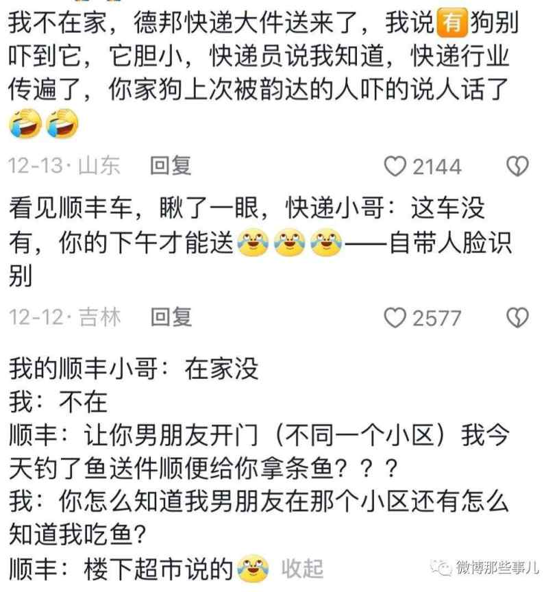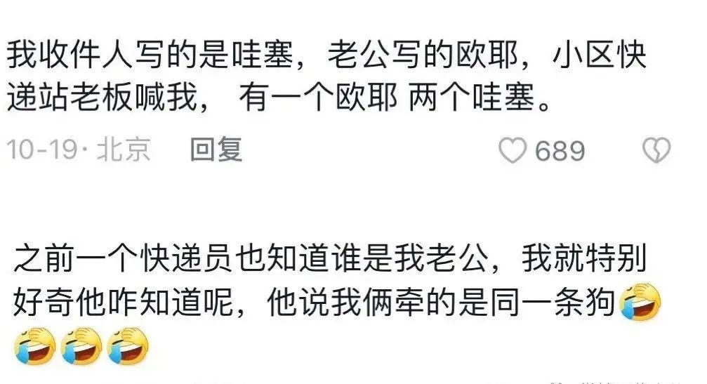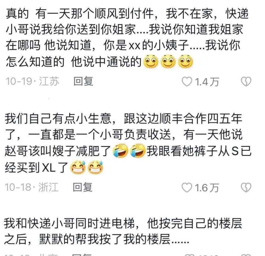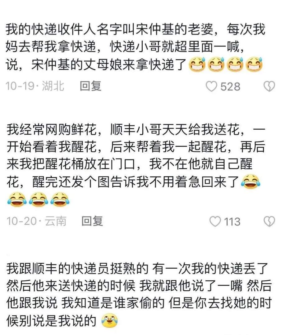 mister喵:我和一个女同事,她姓陈,收件名是“陈富贵”我姓刘,收件名是“刘金凤”,我和快递员说我俩是夫妻