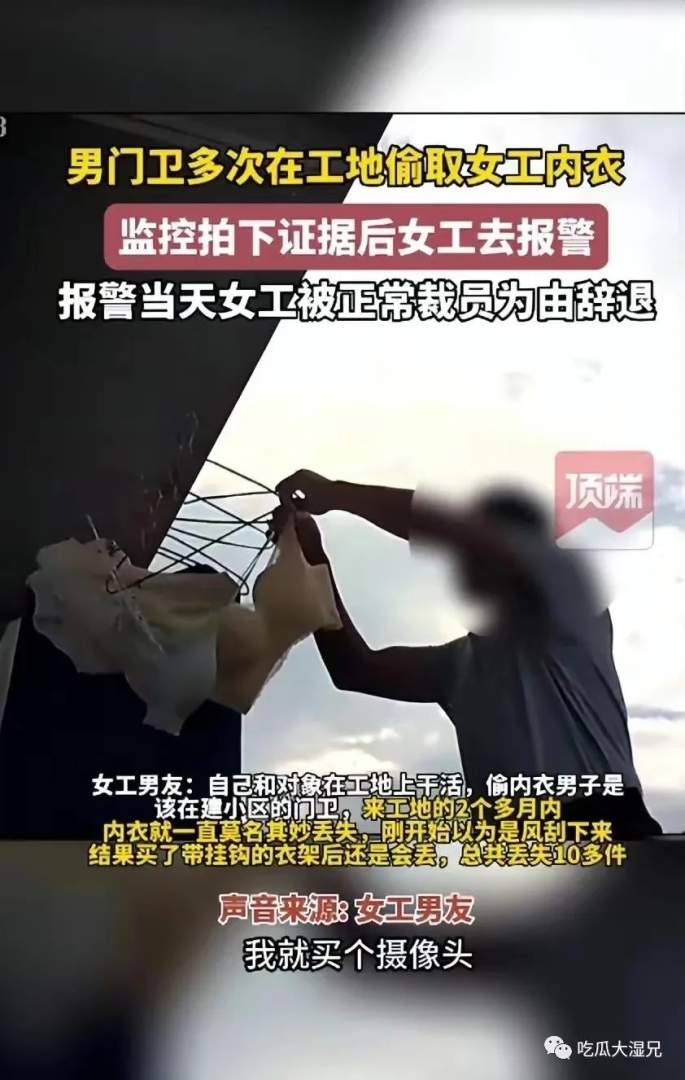 据报道,事发江苏常州,一名工地男门卫被怀疑多次偷取工地女工的内衣。这一事件被监控录像拍下,证据确凿,引发了广泛的社会关注和讨论。
