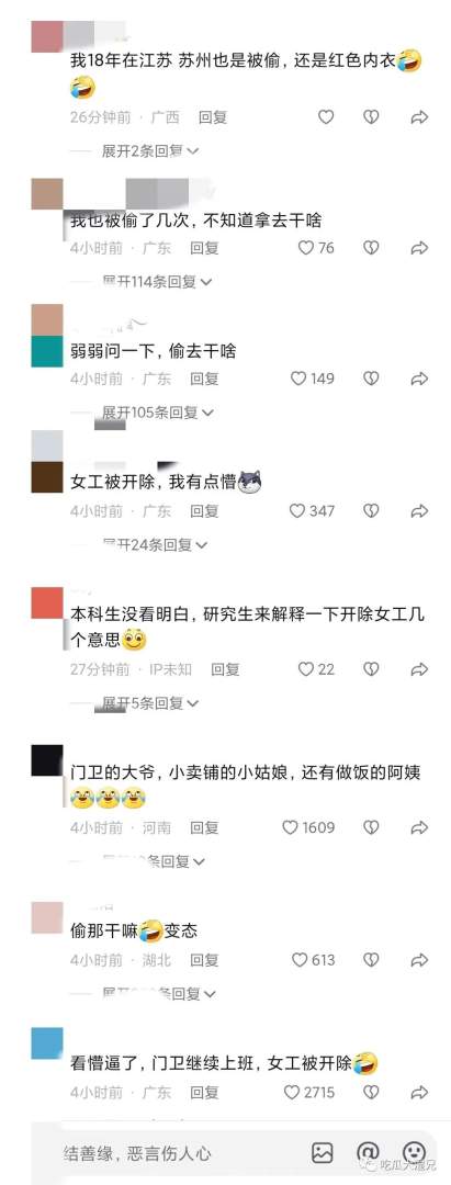 然而,令这名女工感到心寒的是,报警当天她却被工地以正常裁员为由辞退了。而偷内衣的男门卫却安然无恙,仍在正常上班。