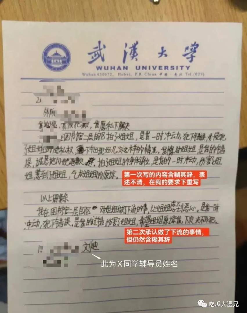 10月11日下午,一女生发帖称今年7月在武大图书馆自习时受到外院一男生性骚扰。女生称当时该男生坐在她对面实施不雅动作,她拍摄留取5段视频后,男生当场承认其不雅行为并写下道歉说明。事后女生多次联系外院老师维权,要求男生书面道歉且不参加评奖评优,3个月过去了仍未得到期待结果,于是选择曝光。