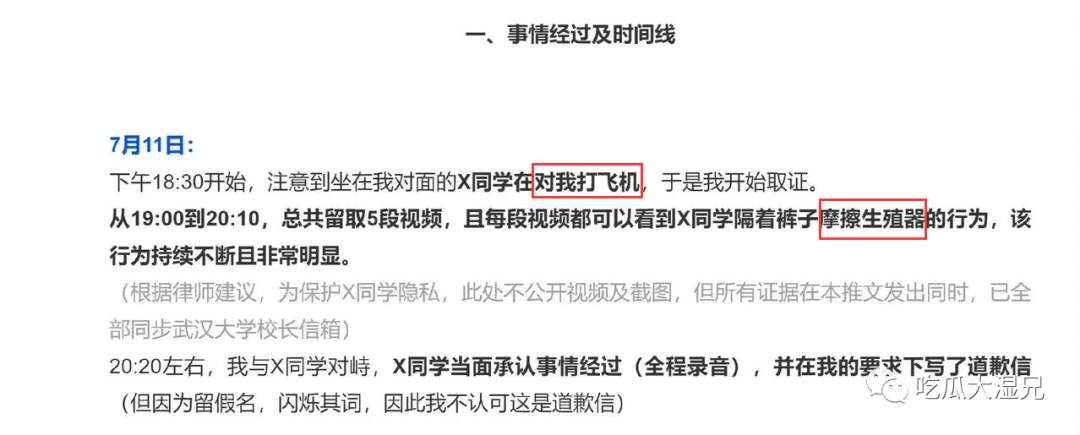 10月11日下午,一女生发帖称今年7月在武汉大学图书馆自习时受到外院一男生性骚扰。女生称当时该男生坐在她对面实施不雅动作,她拍摄留取5段视频后,男生当场承认其不雅行为并写下道歉说明。事后女生多次联系外院老师维权,要求男生书面道歉且不参加评奖评优,3个月过去了仍未得到期待结果,于是选择曝光。