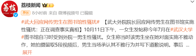 10月11日晚,针对网传“女生称武大男生在图书馆实施性骚扰”,武汉大学发布情况说明: