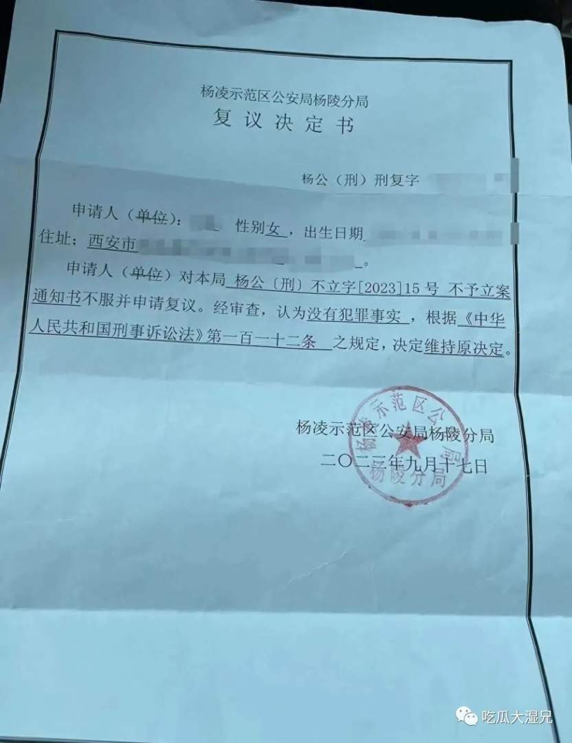据了解,小红曾就不予立案向杨陵分局申请复议。9月17日杨陵分局出具复议决定书,上面写道,经审查认为没有犯罪事实,决定维持原决定。