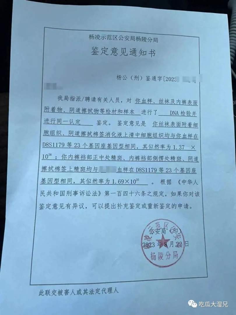 小红说,在公安部门告知她不予立案后的一周即8月22日,杨凌示范区公安局杨陵分局向她出具了鉴定意见书,自己内裤上、阴道擦拭棉签上的精斑和当日劝他喝酒客人的血样在D8S1179等23个基因座基因型相同。