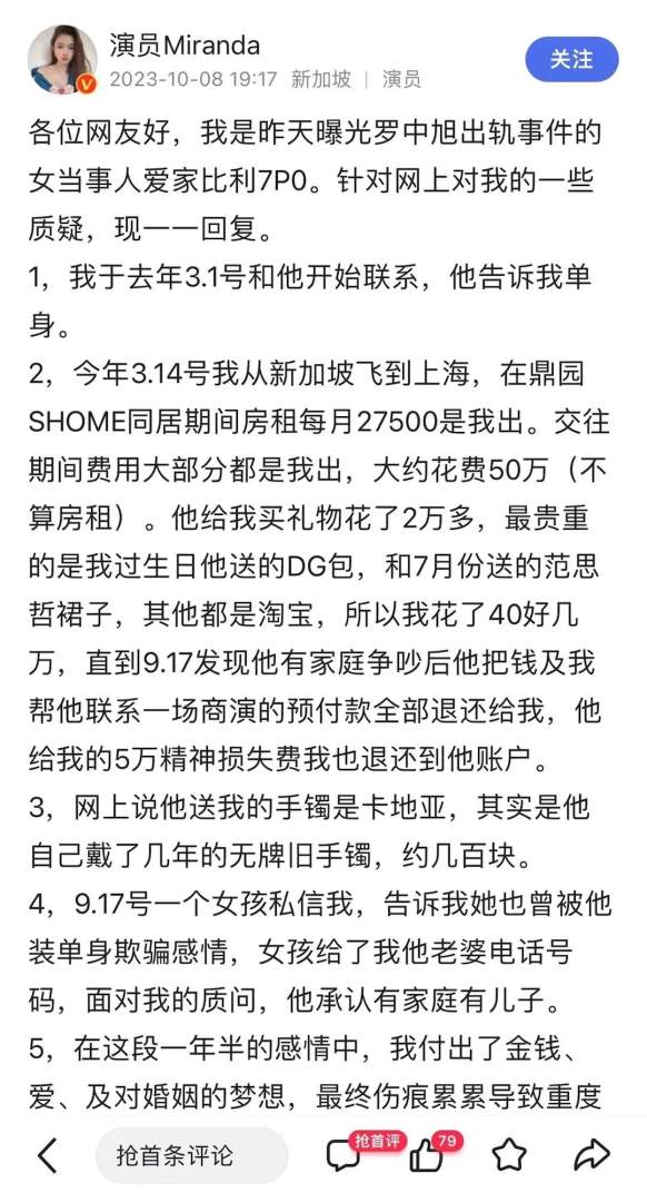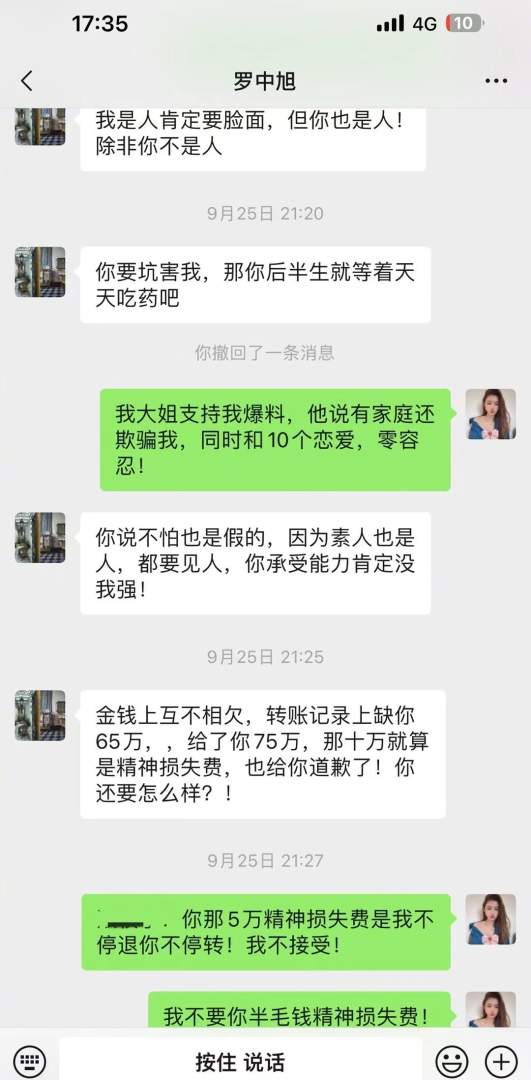 而女方捅破他已婚生子后,罗中旭那边也返还了之前女方花的65万,还多给了10万声称“精神损失费”。