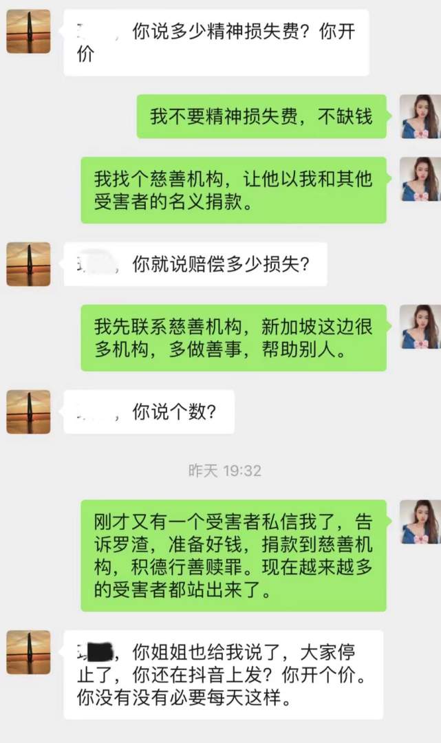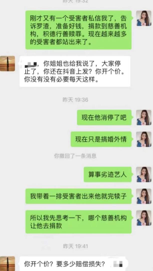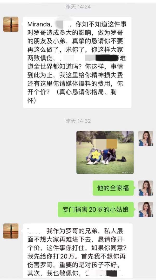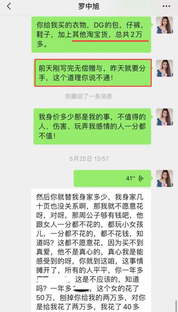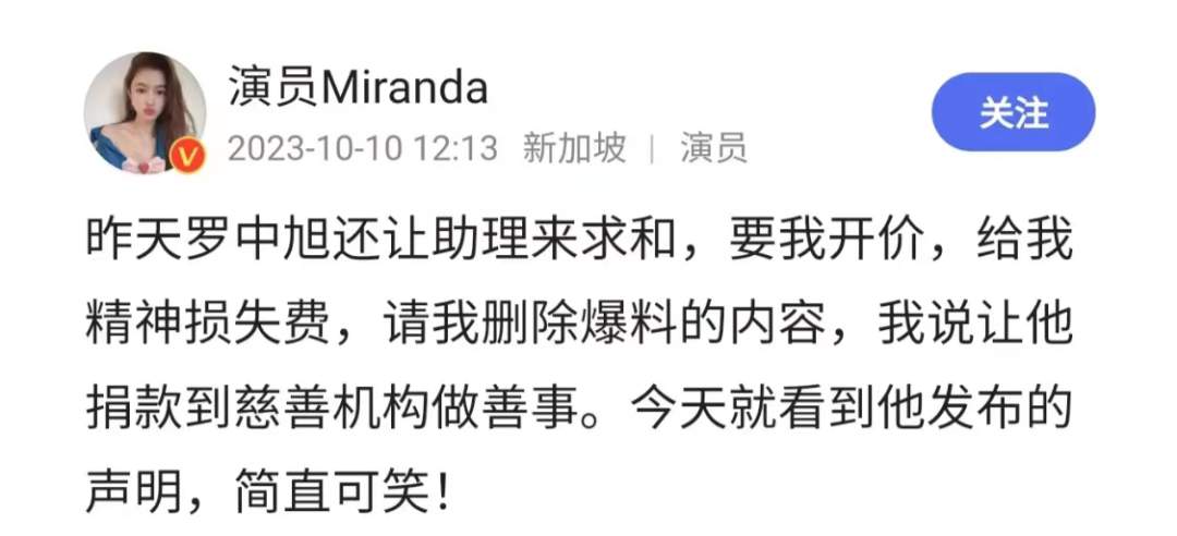 有意思的是罗中旭前脚发声明,后脚女方就又来锤了,说之前罗中旭还让助理求和,让她开价。