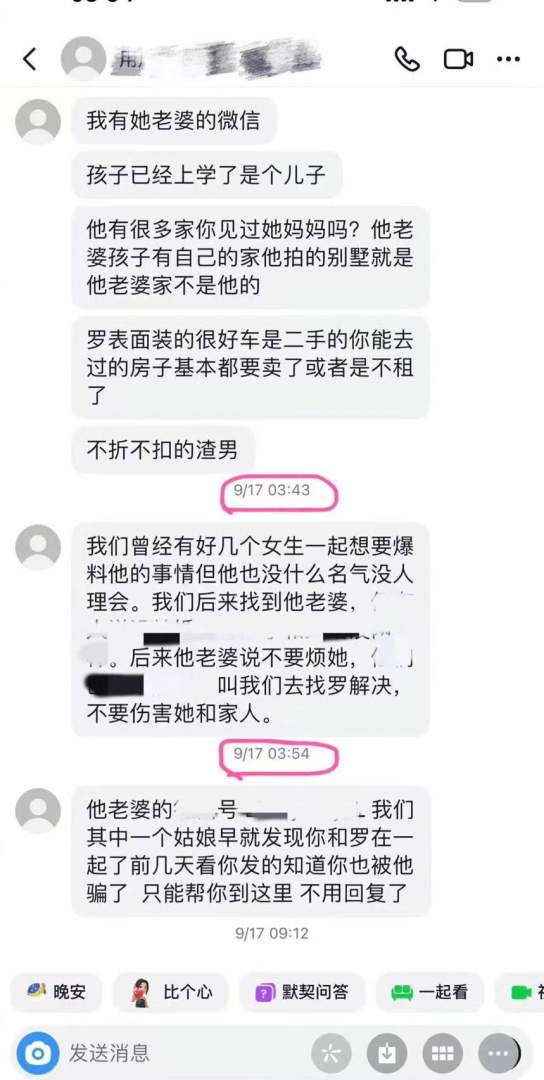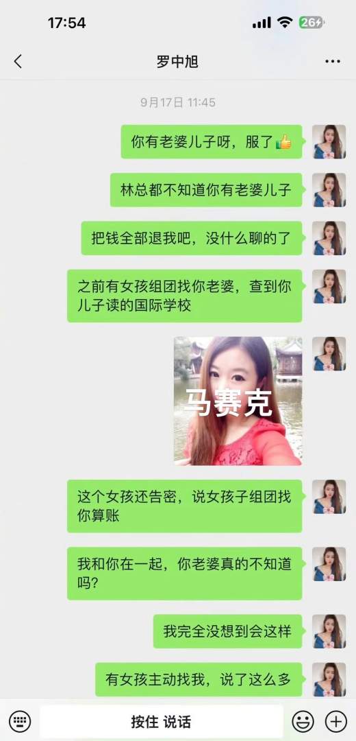 9月17日,有一位陌生女子找到她,说罗中旭有老婆孩子。而且这男的很会装,车是二手的,别墅是老婆家的。