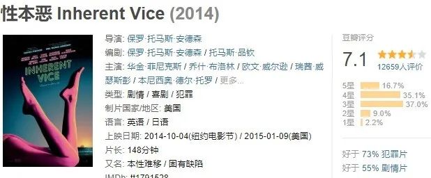 一个黑色侦探故事,PTA才懒得把这样一个好故事装进侦探电影的类型模板里呢,这样的故事本来很容易让人想到【唐人街】那类的片子,它反而削弱了这类电影的辨识度和类型属性,放大了它的文学性和时代质感,全知的说了很多画面不演的,把驱动性的情节和配乐减到很低,片子的后劲却更足了。