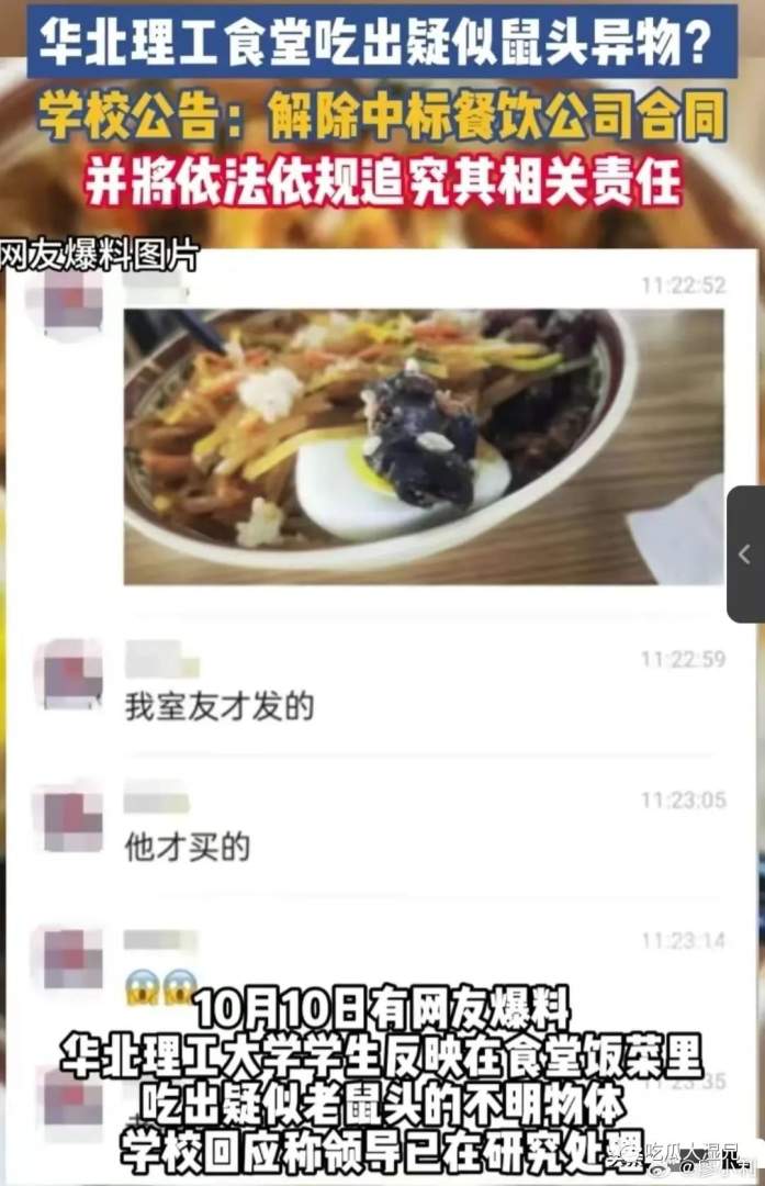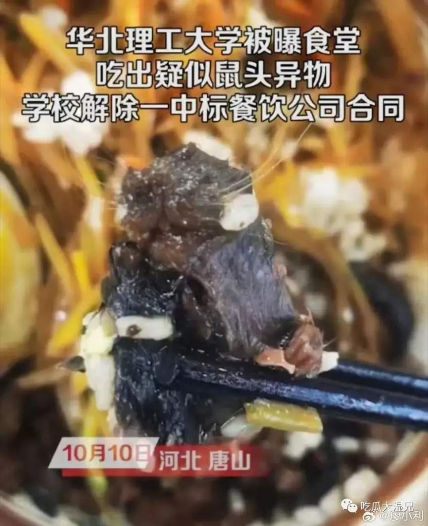 10月10日,有网友爆料,华北理工大学学生反映在食堂饭菜里吃出疑似老鼠头的不明物体。网友发布的群聊天截图显示,10月10日11时22分许,有人在群内发布几张食物图片,其中一块筷子夹住的深色的肉上有几根毛,该人还称这份食物是其室友才在学校梅二(简称“学校食堂梅园二层”)买到的,看上去像是老鼠头,但食堂的店家说是牛肉。有群友则质疑,肉上的毛像是胡须。