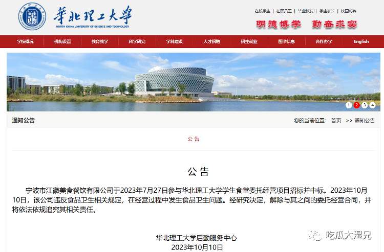 夜间,华北理工大学发布公告,食堂一餐饮公司(宁波市江徽美食餐饮有限公司)违反食品卫生相关规定,在经营过程中发生食品卫生问题。经研究决定,解除与其之间的委托经营合同,并将依法依规追究其相关责任。