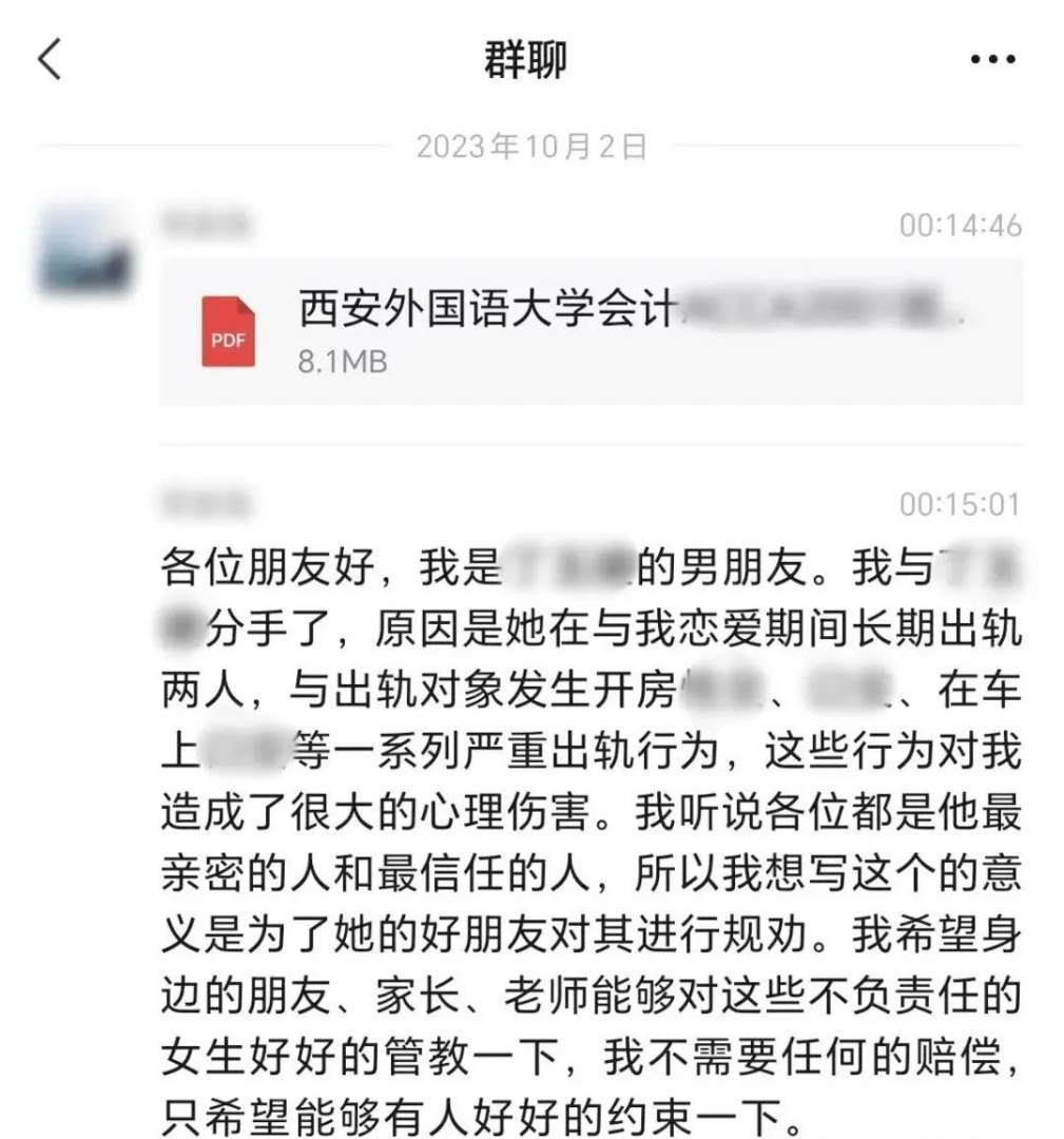 我和西安外国语大学丁在2022年10月23日至2023年10月2日期间交往,现正式分手,分手具体原因现与大家公布:由于丁在与我恋爱期间长期出轨两人,和我交往的同时与出轨对象开房、在车上口?等一系列严重出轨行为,这些行为对我造成了很大的心理伤害,我认为我是西安外国语大学纯爱大傻X。