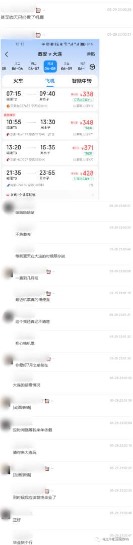 2023-5-21与男2号暧昧,与其分享自己的日常,与男2号聊天用词可爱,并查询去找男2号的机票,打算去大连旅行。
