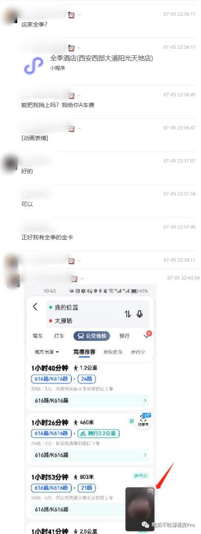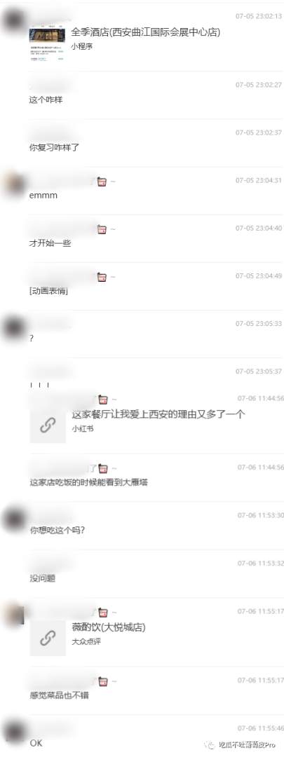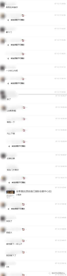 2023年7月12日丁与男2号的聊天记录,两个人在西安见面,男2号来接她,当晚两人在外吃饭并住在曲江的全季酒店
