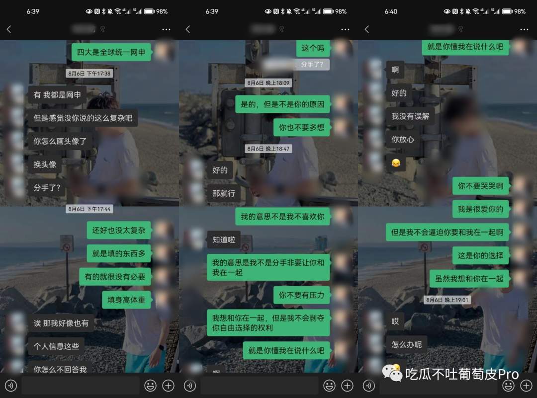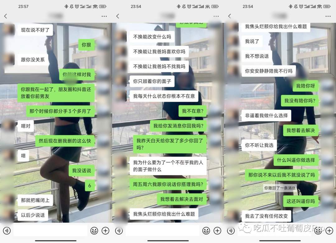 2023年7月26日丁以其父母不同意我们的恋爱关系为由跟我闹分手吵架,另一方面同一天同一时间她跟男1号表现的像个舔狗一样,明明男1号就是在玩她,她还舔着脸说她分手不是为了逼男1号跟她在一起,她甘愿作为男1号X欲发泄的玩物。
