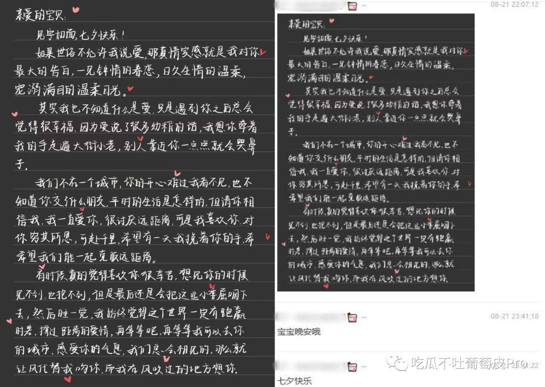 这是七夕当天丁发给男1号的小作文,当天她都没有跟我说七夕快乐。当时我在备考CPA比较忙,而后丁数次跟我埋怨为什么七夕当天我没有任何表示,为什么不给她买礼物。