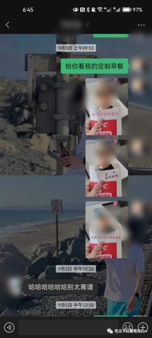 我跟丁约定每天吃饭会给对方分享食物的照片,2023年7月26号她实习下班后瞒着我与男1号约会,当天下班后男1号来接她,在男1号的车上丁对男1号进行了口?,然后与其约会。当时她很长时间没有回我消息也没有拍吃的饭,并用手机没电没注意和IPAD消息没有弹窗作为没有拍饭的借口,而我因为她没回消息在担心她的安全问题,我真的是西安外国语纯爱大傻X了。
