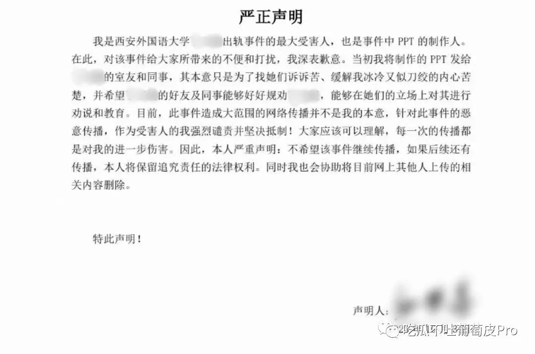 随着事件的发酵,疑似男主当事人发表声明,称当初将制作的 PPT 发给丁的室友和同事,其本意只是为了找她们诉诉苦、缓解冰冷又似刀绞的内心苦楚,并希望丁的好友及同事能够好好规劝丁,能够在她们的立场上对其进行劝说和教育。