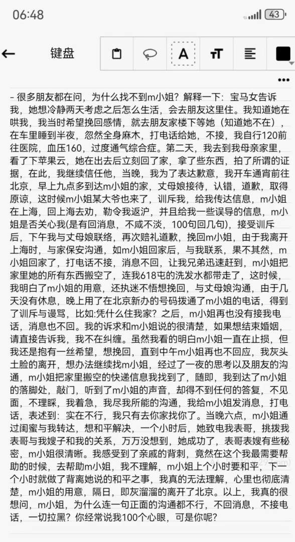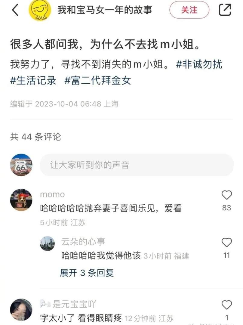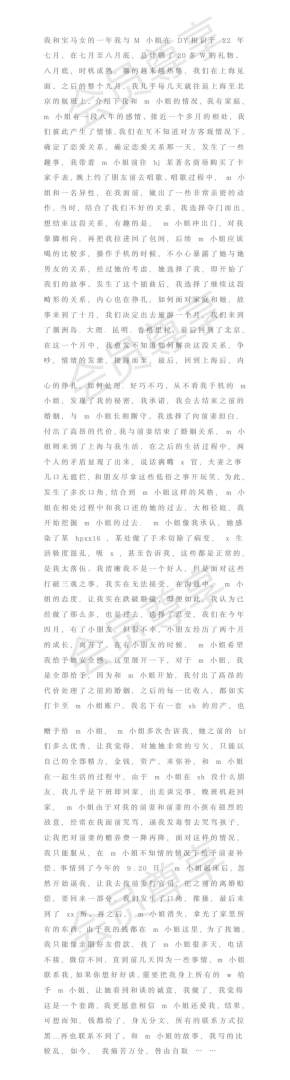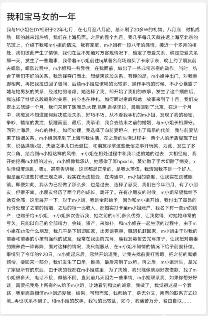 后来这个男人为了M而离婚,把钱全给了M,包括一套上海的房子。现在M卷钱跑路了,他找不到M,于是发文控诉她。