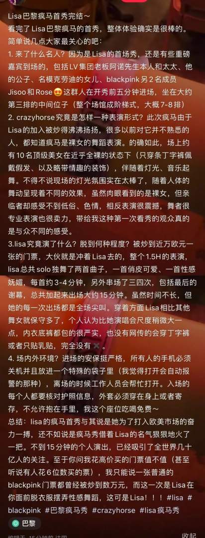 9月28-30日,知名韩国女团BLACKPINK成员Lisa,在巴黎疯马秀“CRAZY HORSE”登台演出。共五场表演,演出票价250欧元起(约合2000RMB)。