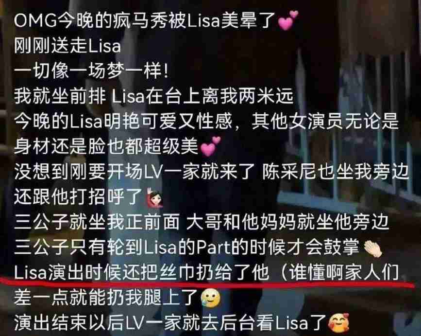 依据网友的描述,lv三公子带着哥哥和母亲观看了Lisa的疯马秀演出。